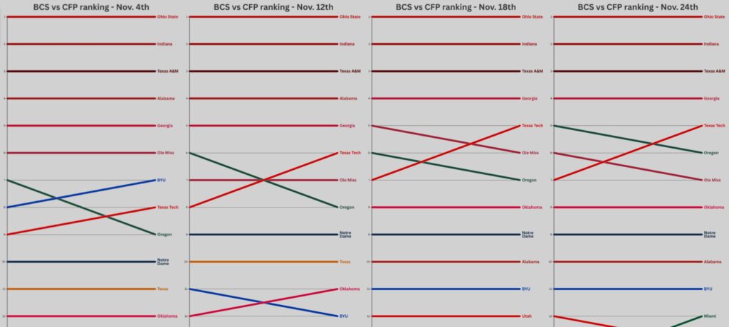 So far in 2025, the committee and the BCS have had the same group of teams in the top 10 with some variances in specific rankings. If you extended the range to the top 12, only last week with No. 12 Miami did we see a shakeup from the BCS rankings.