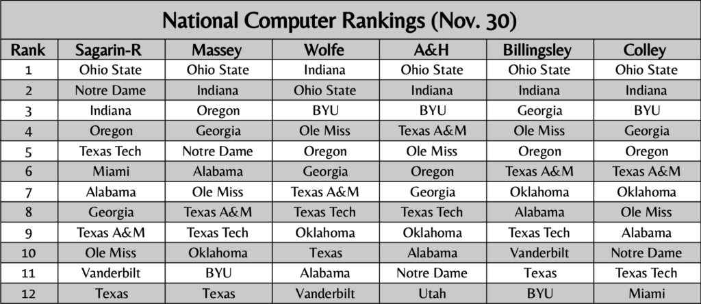 Looking at each of the computers, Texas is in the top 12 in four of the six. The Longhorns come in at No. 12 for both Sagarin-R and Massey, No. 11 in Billingsley, and a playoff qualifying No. 10 in Wolfe. A&H and Colley have the Longhorns outside of the top 12.
