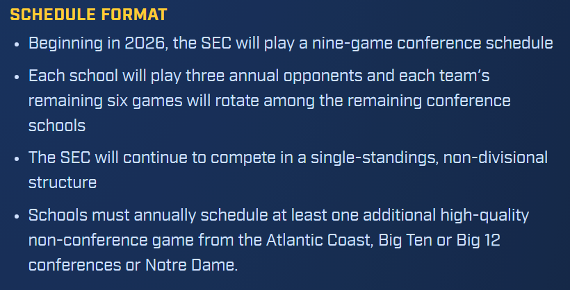 From the SEC 2026-2029 opponents release: “Schools must annually schedule at least one additional high-quality non-conference game from the Atlantic Coast, Big Ten or Big 12 conferences or Notre Dame.”