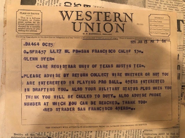 He loved to downplay his football career, evidenced by how he reacted to a draft questionnaire from the 49ers that he received via Western Union. He immediately dismissed the idea of professional football and he opted instead to become a dentist. If that kind of decision was made today, I’m not sure I’d want that doctor around my teeth.