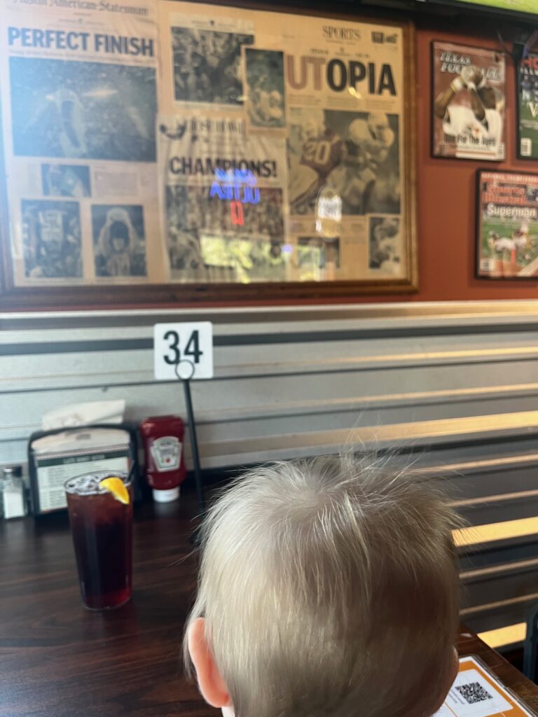 Determined to reverse the juju and the ominous lightning bolt of a Toby Keith reference in the middle of Hate Week, I took my third child to Dirty Martin’s for lunch. You go to a place like that and it’s like you’re in a warm bath of Longhorn lore. Earl is on the wall, Ricky is too—it just feels right. I got the OT Special, grilled onions and jalapeños with tater tots and was given #34 organically, without asking for it. A sign from Heaven.