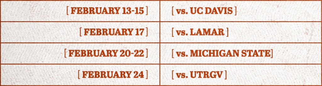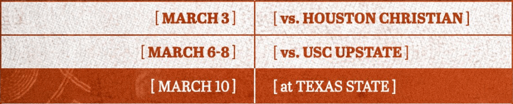 February 13th-24th The Longhorns will start the first eight games of the season at the Disch, and they will be expected to win all of those opening games. Texas previously had an opening trip to San Diego scheduled but Jim Schlossnagle had that changed.
