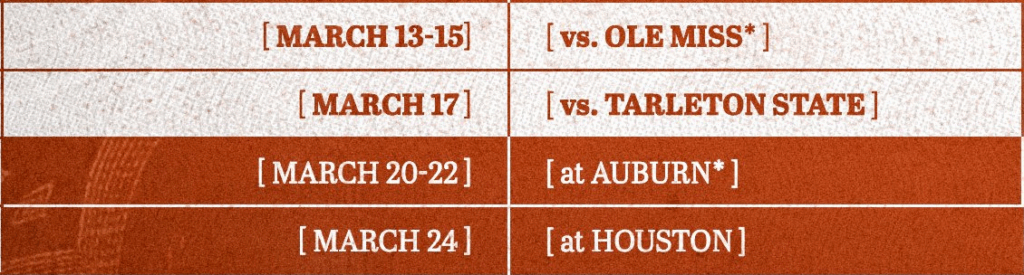 No new news here with Ole Miss being the first opponent of conference play. What is new, is that Texas will be headed on the road immediately after the Auburn series. The Longhorns will hardly have 12 to 24 hours in Austin before flying down to Houston.