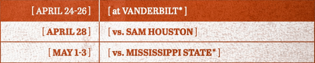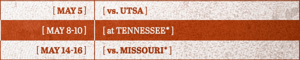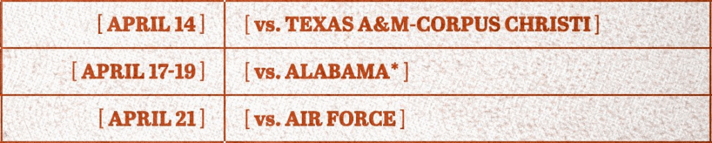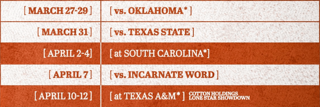 Late March to early April is where Texas enters the rivalry stretch of the schedule. Starting off with Oklahoma at home and then hosting Texas State as well, there will be some energy to those games. Texas heads back on the road to South Carolina, before returning back home for Incarnate Word.