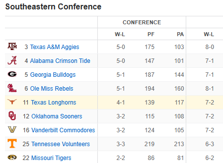 - Texas: Bye, at Georgia, Arkansas, Texas A&M