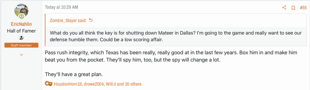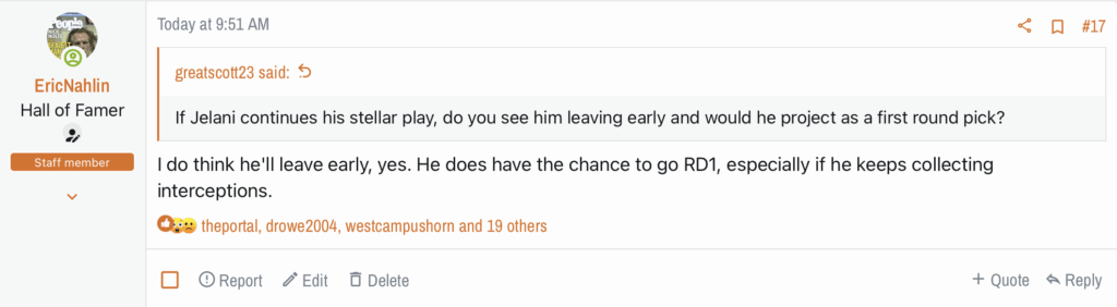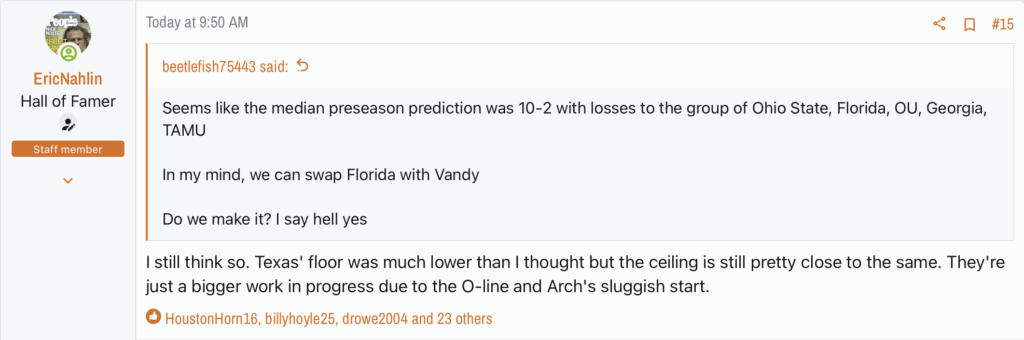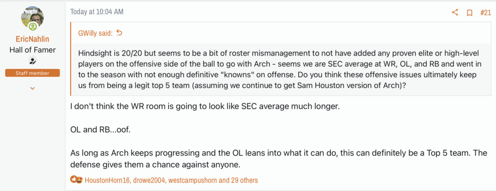 CFB today centered on the state of Oklahoma. First, it was announced that Mike Gundy has been fired after a fantastic run in Stillwater. The more surprising news was OU’s star quarterback, John Mateer, will need to have surgery on his right hand. He’ll very likely miss the Red River Shootout. That’s a bummer. I wanted the dual-threat to test the Texas defense. This first reply was made before the news of the injury broke. It’s still relevant as Texas will face other dual-threat quarterbacks on the schedule.
