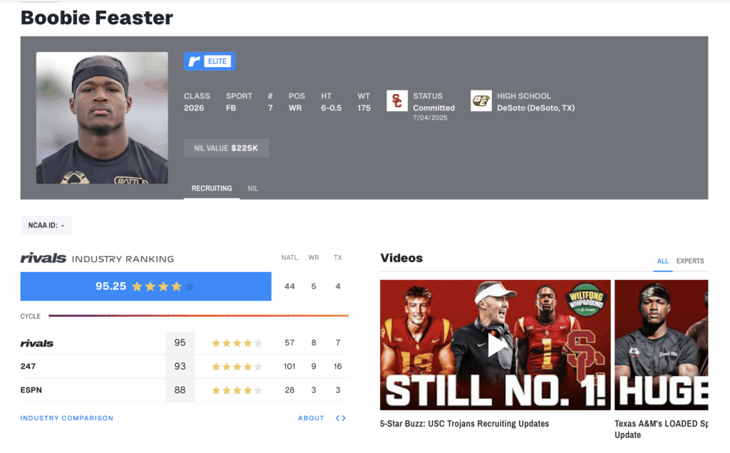 The three biggest risers for USC in the latest Rivals rankings update are wide receiver Boobie Feaster and offensive lineman Vlad Dyakonov. Feaster was bumped up 40+ spots to No. 57 overall, and Dyakonov 30+ spots to No. 68 in the Rivals On300.