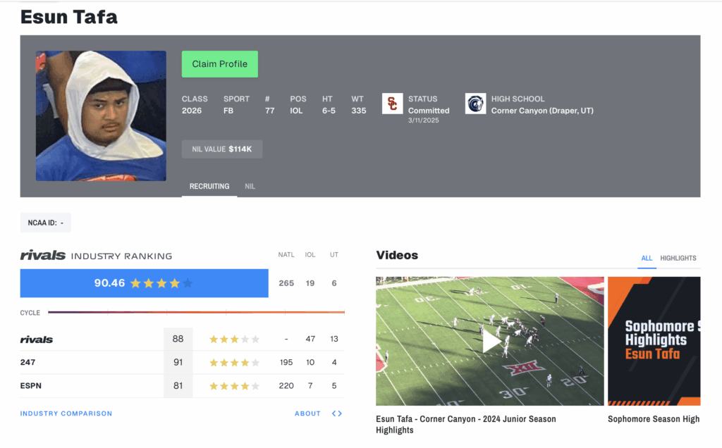 No. 265 Offensive Lineman Esun Tafa – Corner Canyon (UT)